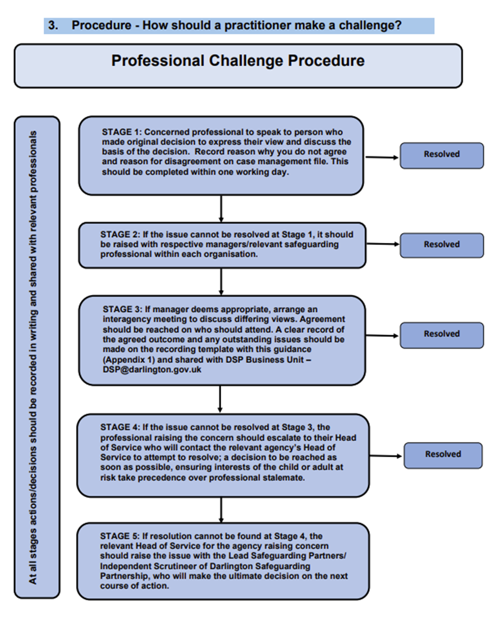 Stage 3: If issue is not resolved at Stage 2: if manager deems appropriate, an interagency meeting to discuss differing views should be arranged. Agreement should be reached on who should attend. A clear record of discussion and the agreed outcomes/actions including details of any outstanding issues should be made using the Professional Challenge Recording Tool (Appendix 1). Details of next steps should also be captured. A copy of the recording tool should be shared with the DSP Business Unit (DSP@darlington.gov.uk) for recording purposes.